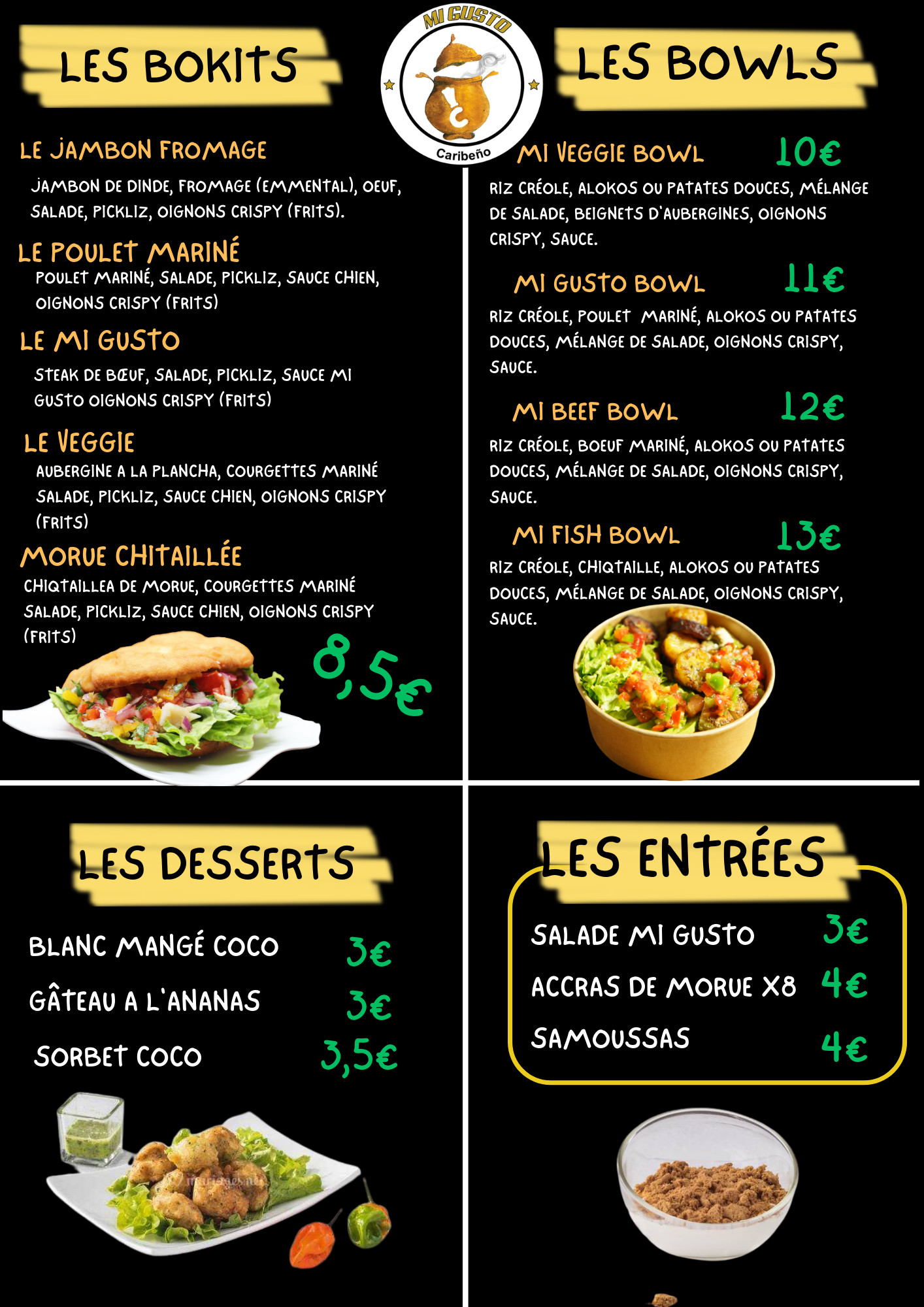 Désolé je ne laisse jamais de commentaire en général, mais là je n’ai pas le choix. J’ai mangé cette semaine dans le foot truck. C’était juste un massacre. Un bokit rempli avec des aiguillettes de poulet mariné du jamais. Il avait aucun goût aucune sauce s’il vous plaît. Laissez les spécialités aux professionnels et aux personnes qui connaissent réellement la patronne arrive avec un T-shirt rose remplie de taches comme si on lui a dit Jo régurgité dessus plusieurs fois super Propre pour l’image du foot truc sincèrement je ne vous recommande pas se food truck je suis désolé. Si mon commentaire je suis au France, mais je suis obligé de raconter ce que j’ai vécu.