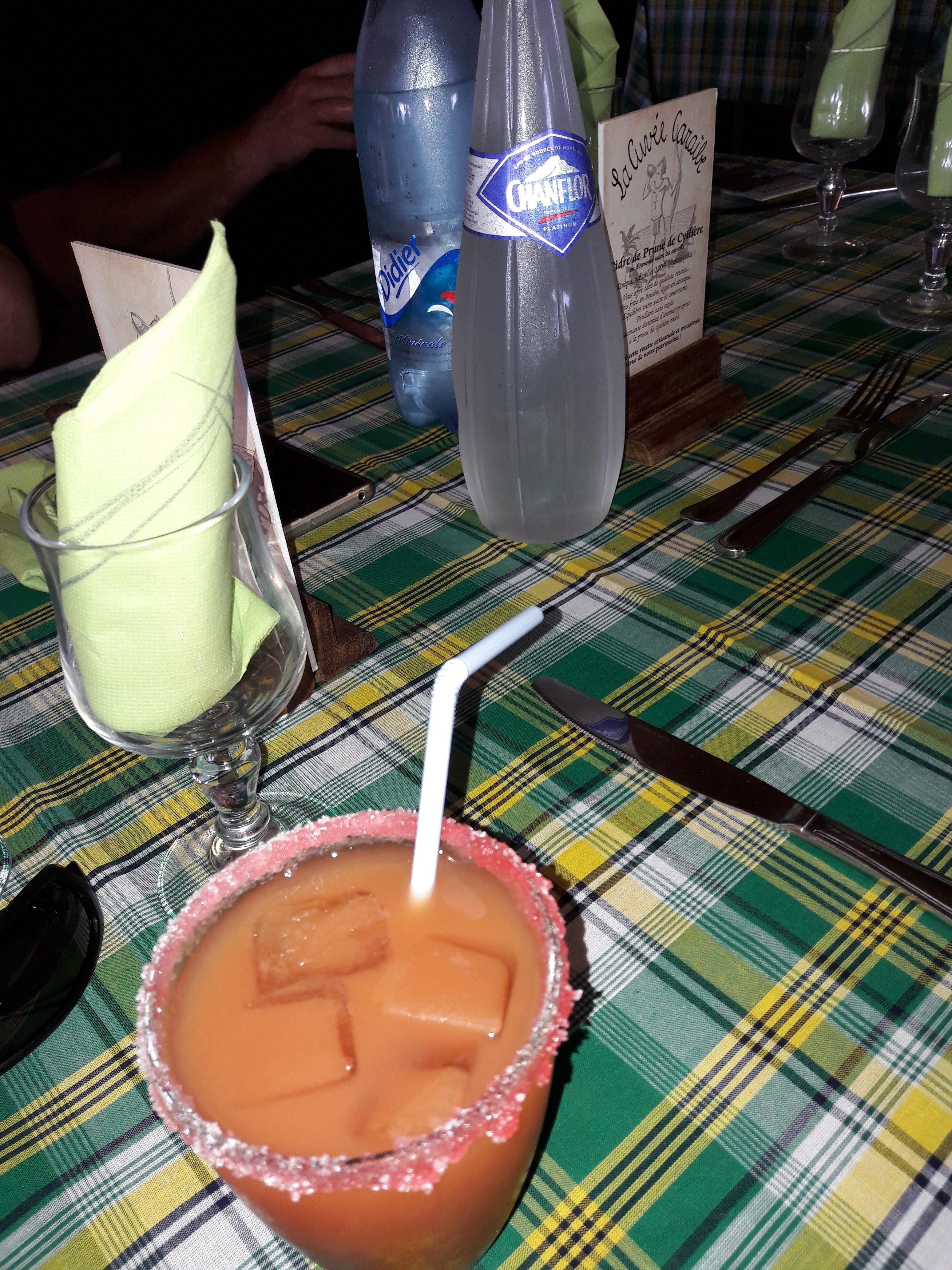 Un cadre est MAGNIFIQUE. Un accueil fort sympathique, une serveuse très polie et disponible. (On y a été en septembre, ceci explique peut être cela...) Les menus vont de 18 à 37€ (entrée, plat et dessert). En image vous avez le menu à 18€: Goûteux, copieux et typiquement créole. On s'explose la panse à la fin du repas. Entrée: Accra de morue et légumes Plat: poulet Columbo avec comme accompagnement riz, lentille, banane, mousseline, manioc. Dessert au choix: glace/sorbet/flan au coco ou blanc mangé On y mange avec oiseaux, poule et chat.