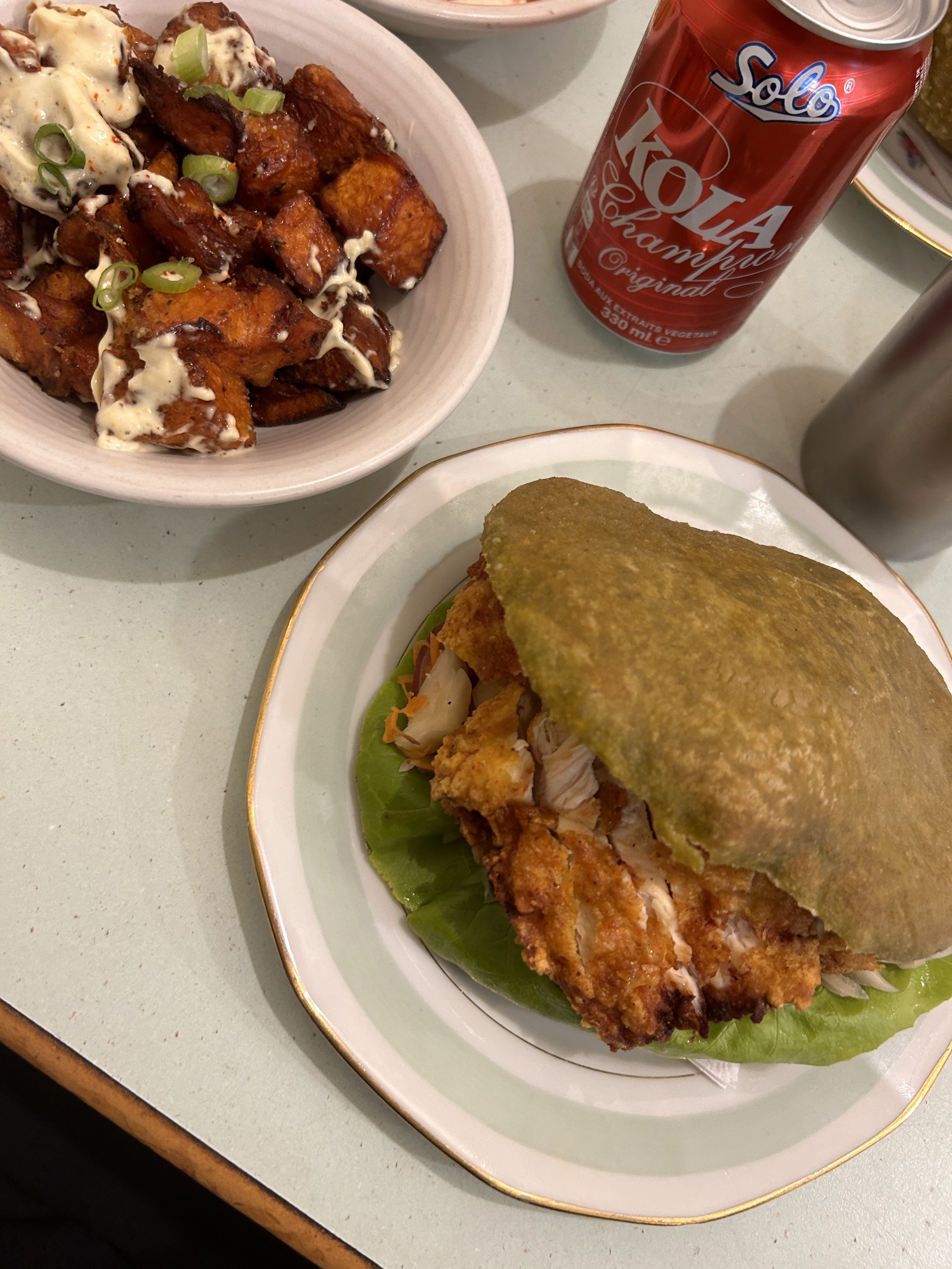bonne nourriture. nous avons eu le poulet frit et les patates douces (excellentes). n'était pas fan du sandwich végétarien qui était essentiellement un pleurote poêlé sur un lit de chou et des carottes sur un petit pain. il manquait juste de saveur et pas assez de champignons. l'ambiance était sympa avec les boîtes aux lettres accrochées au mur. Mathilde et son mari ont ouvert ce spot il y a 6 mois et j'espère qu'ils continueront à prospérer.